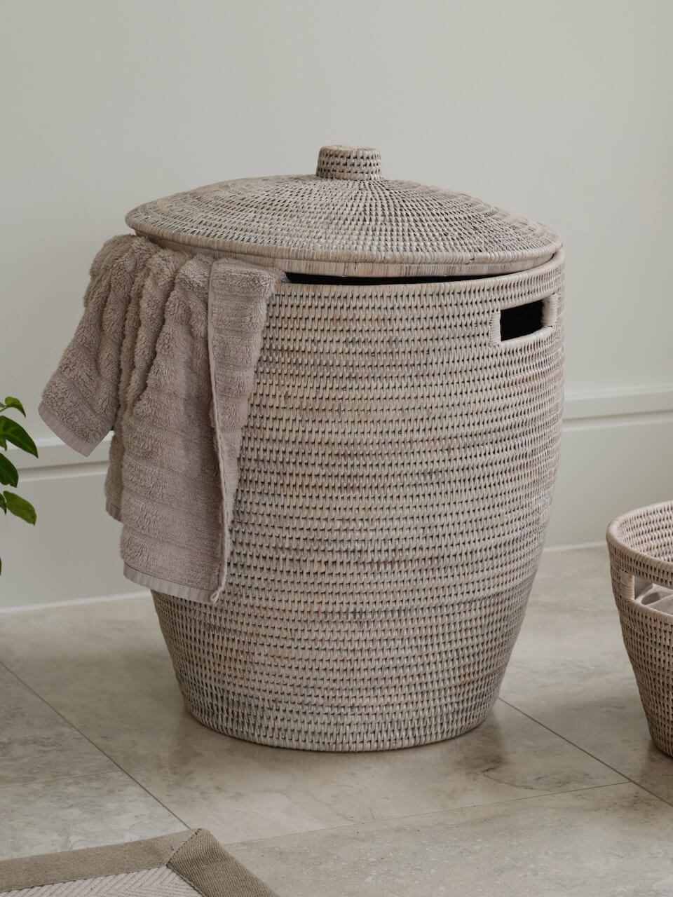 The Jarra White Rattan Laundry Basket is a handwoven piece, with a beautifully sculptured shape, that provides a stylish way to hide your laundry. Adding natural materials to your bathroom in pieces such as this instantly provides that touch of life required to turn it into a spa like sanctuary.