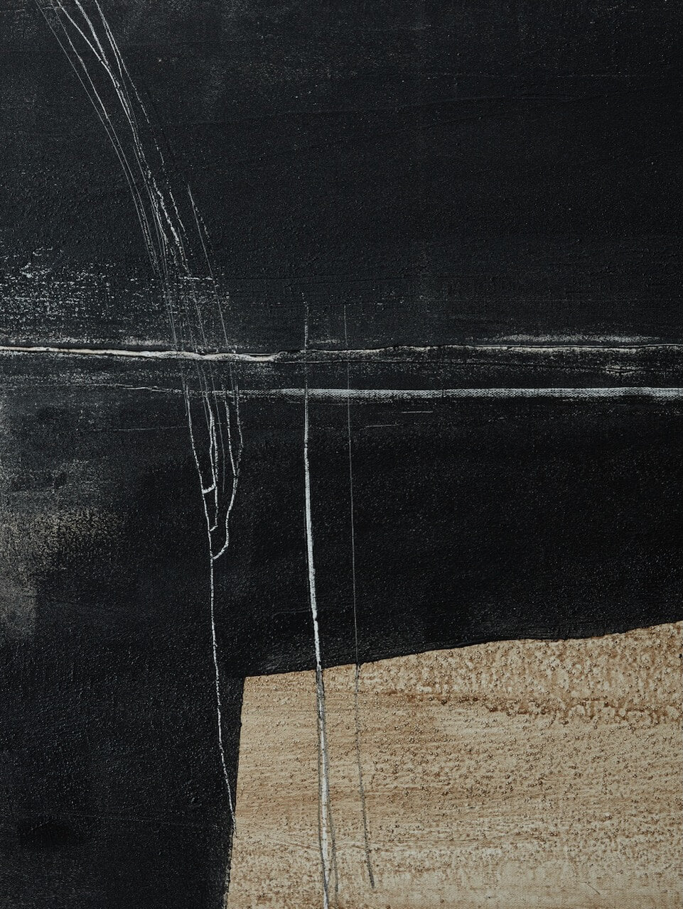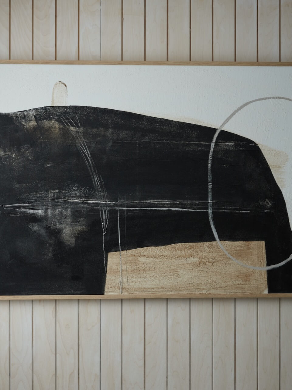 A modern abstract painting with a combination of bold charcoal and neutral tones to create a striking attraction for your walls. The painting is completed with a slender oak frame.